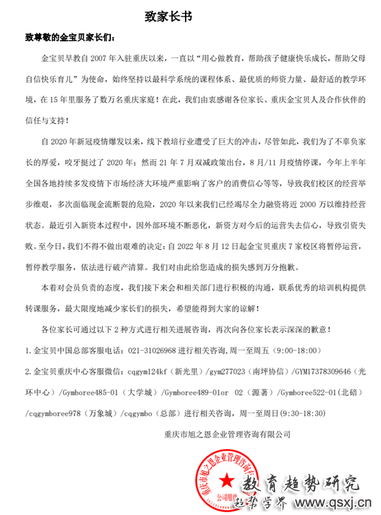 8月11日深夜,金宝贝重庆中心发布《致家长书》,称自2022年8月12日起,金宝贝重庆7家校区将暂停运营。