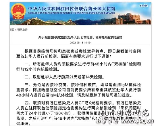 根据目前疫情形势和奥密克戎毒株变异特点,即日起我馆对自阿联酋赴华人员行前检测、隔离有关要求进行以下调整: