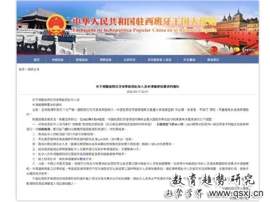 根据疫情发展状况、病毒变异特点,自2022年5月19日起,中国驻西班牙使领馆对确有必要从西班牙乘机赴华的乘客有关要求进行以下调整: